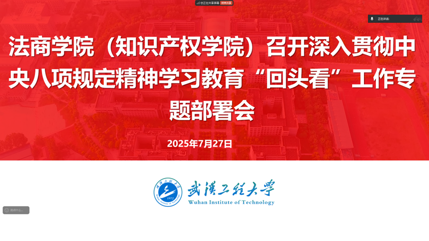 (通讯员 贺阳)7月26日晚,williamhill英国官网(知识产权学院)召开深入贯彻中央八项规定精神学习教育“回头看”工作专题部署会。学院党委委员及各党支部书记参会,会议由学院党委书记陈朝娟主持,重点传达学习上级文件精神、通报典型案例,并对下一阶段工作作出安排。