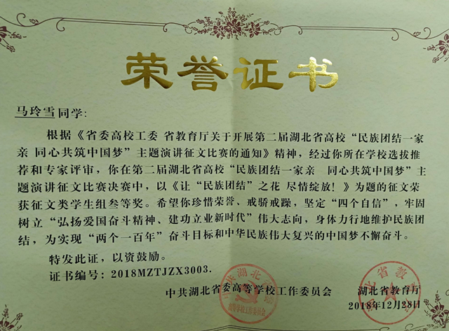 20181228日,WilliamHill官网18级马玲雪同学在第二届湖北省高校“民族团结一家亲同心共筑中国梦”主题演讲征文比赛决赛中,以《让“民族团结”之花尽情绽放!》为题的征文荣获征文类学生组叁等奖。