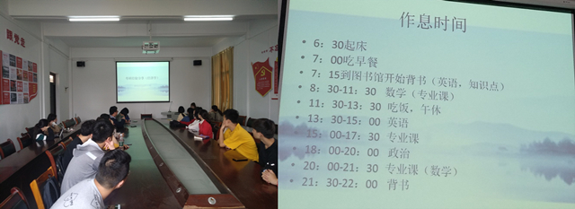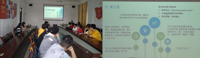 王蝶同学与与会同学分享了她的考研经历。王蝶同学在今年研究生入学考试中以393分的笔试第二名和面试第一名的优秀成绩成功考入中国地质大学(武汉)。她首先分析了近年来的考研情况——考研人数不断增长和国家线不断提高,并就考研院校选择为同学了提出建议。接下来,王蝶同学分别从数学、英语、专业课、政治四个学科介绍了每个阶段应该怎样针对性复习,为同学们合理精确规划备考复习提供了宝贵建议。最后她给同学们分享了她考研时期的作息时间表。坚定的信念、分阶段分解学习任务以及合理的作息安排是她成功的法宝。