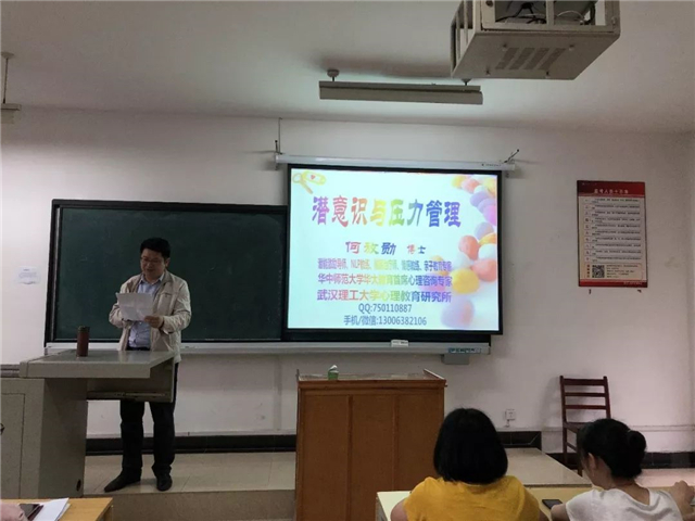 5月16日,全国知名临床催眠治疗专家、武汉理工大学心理教育研究所、华中师范大学华大教育培训中心首席心理咨询专家何放勋副教授做客williamhill英国官网心理健康教育专题讲座。讲解潜意识与压力管理,拓展师生对压力的认识和管理。讲座由williamhill英国官网院长金明浩主持,williamhill英国官网党委副书记刘念出席。学院班主任、学生心理委员共聆讲座。