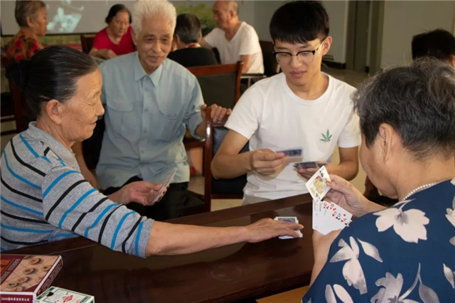 午饭过后,有一个老爷爷拄着拐杖,颤颤巍巍地走到我们的旁边,让我们帮他看看他的儿子是不是把他拉到了黑名单,为什么电话打不通。我们用老人的手机尝试拨打电话,也是无果。但是用同学的电话却能拨通,最后联系上家人解决了老人的问题。这件事情正是体现了老人逐渐与社会发展脱节的问题。电子产品的使用不便,使得他们难以跟上社会的进步。老人已经是九十岁的高龄,儿子也接近六十岁,孙子也没有时间精力去教他们,爷爷就只能在有志愿学生来的时候寻求帮助。这让我们有了新的启发:我们之后可以将普及电子产品使用的活动带进养老院,让老人的晚年生活更加便捷。