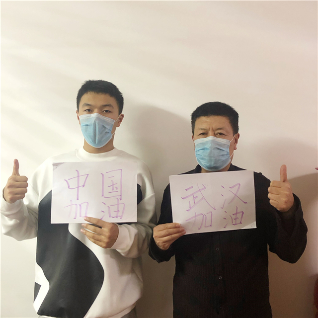 (韩佳轩(左)与父亲韩元栋(右)为武汉加油,为中国加油)