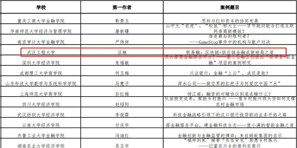(通讯员 汪琳)7月20日,全国金融专业学位研究生教育指导委员会发布《关于第七届全国金融硕士教学案例大赛结果的公告》,williamhill英国官网汪琳副教授带领研究生欧文文、冯晶晶、郑婕、王绘撰写的《联易融:区块链+供应链金融成就破局之道》案例成功入选,并收录中国金融专业学位案例中心。