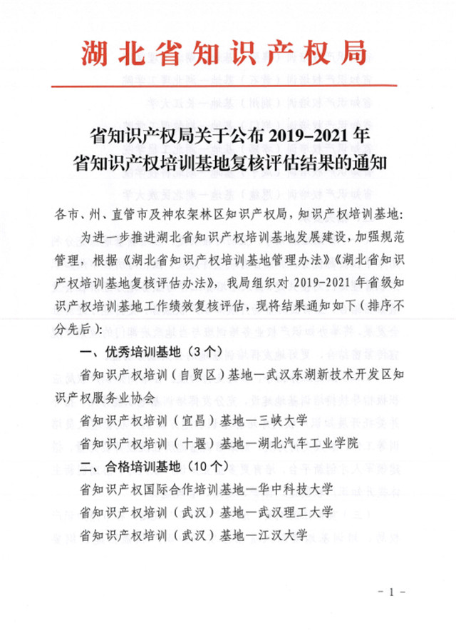 本网讯(通讯员 林周)11月8日至9日,湖北省知识产权局举办2021年湖北省知识产权培训基地工作研讨会,会上公布了2019-2021年省知识产权培训基地第三轮复核评估结果,由WilliamHill官网williamhill英国官网共建的湖北省知识产权培训(自贸区)基地评为优秀等次。全省知识产权培训基地绩效评估每2年开展一次。本次评估是湖北省知识产权局依据《湖北省知识产权培训基地管理办法》《湖北省知识产权培训基地考核办法》组织的第三轮复核评估,全省13个知识产权培训基地中有3个获评优秀基地,分别是武汉东湖新技术开发区知识产权服务业协会、湖北汽车工业学院、三峡大学3个单位。