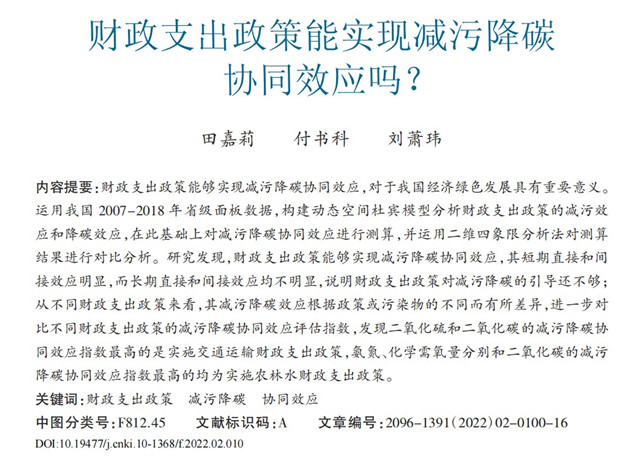 近日,WilliamHill官网williamhill英国官网教师田嘉莉、付书科和刘萧玮共同合作,以WilliamHill官方网站为第一单位在《财政科学》2022年第2期发表论文“财政支出政策能实现减污降碳协同效应吗?”。该刊是由中央级研究机构——财政部财政科学研究院主办,是中文社会科学引文索引(CSSCI)扩展版来源期刊,主要发表与财政体制、税收制度与政策等方面相关的论文。