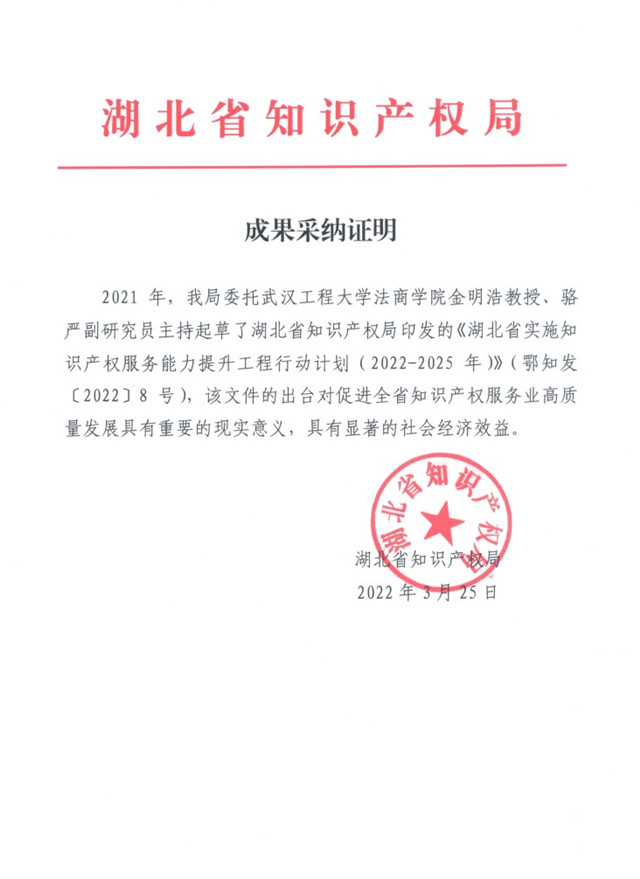 本网讯(通讯员 骆严)受湖北省知识产权局委托,我院金明浩教授、骆严副研究员主持起草了《湖北省实施知识产权服务能力提升工程行动计划(2022—2025年)》(鄂知发〔2022〕8号)。该文件出台对促进全省知识产权服务业高质量发展具有重要的现实意义和显著的社会经济效益。