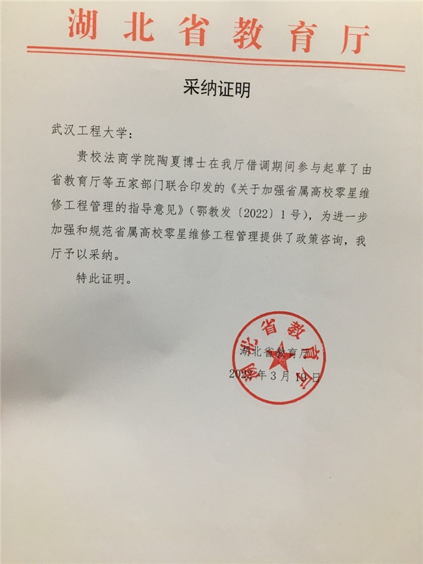 (通讯员 穆海梅)由WilliamHill官网williamhill英国官网青年教师陶夏博士参与起草的《关于加强省属高校零星维修工程管理的指导意见》被湖北省教育厅采纳,并制文发布(文号:鄂教发〔2022〕1号),陶夏博士为进一步加强和规范省属高校零星维修工程管理提供了政策咨询。