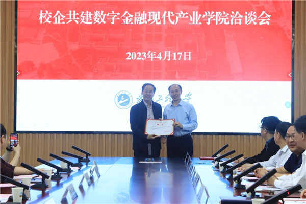 本网讯(通讯员 刘敏)4月17日上午,校企共建数字金融现代产业学院洽谈会在流芳校区综合楼103会议室顺利召开。安信证券股份有限公司董事长黄炎勋、深圳市前海九派资本管理合伙企业创始合伙人陈郧山、深圳工大联合股份有限公司董事长张弘雨、深圳工大联合股份有限公司总经理高庆丰、深圳工大联合股份有限公司董事会秘书张健、北京校友会副秘书长赵虎等6位杰出校友受邀参加,校党委副书记郑丹凤,校党委常委、副校长喻发全出席会议,洽谈会由正校级干部叶芃主持。