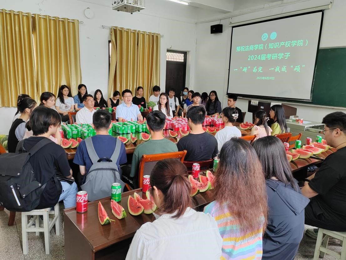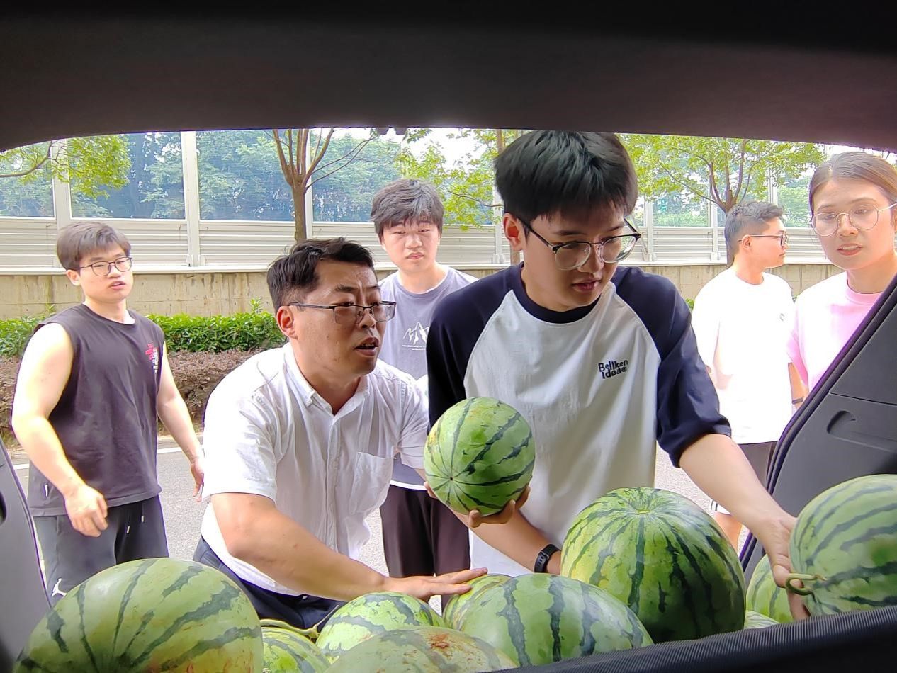 本网讯(通讯员 章文杰、王颖)为深入开展学习贯彻习近平新时代中国特色社会主义思想主题教育,深刻践行“一线工作法”,切实帮助学院暑期留校考研学子坚定考研目标、缓解备考压力、增强必胜信心,6月30日,学院党委书记杨克平、党委副书记孙勇、国贸教研室主任龚梦琪以及全体辅导员为2024届考研学子送上考研“加油瓜”和祝福。