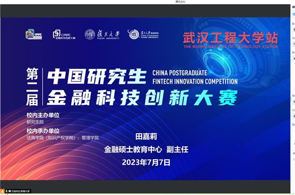 (通讯员 宋佳丽)为推动金融科技领域创新人才培养,提升金融专业学位研究生的实践创新能力,7月7日,学院金融硕士(MF)教育中心组织召开研究生金融科技创新大赛线上动员会。williamhill英国官网(知识产权学院)副院长付书科,金融硕士(MF)教育中心副主任田嘉莉,研究生辅导员宋佳丽,williamhill英国官网(知识产权学院)、管理学院和计算机科学与工程学院近百名硕士研究生参加此次动员会。会议由副院长付书科主持。