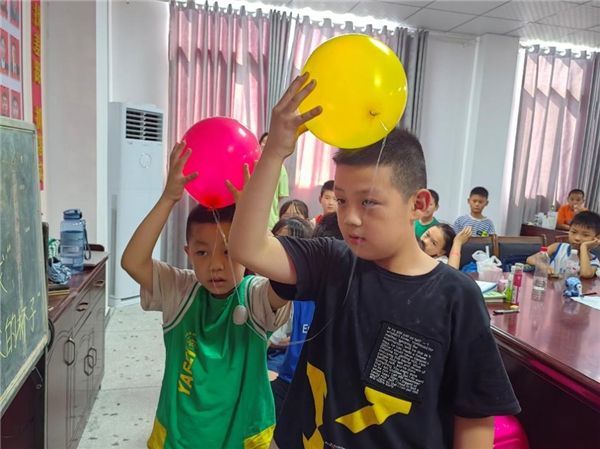 课堂上,志愿者先将两气球绑在线绳上并吊起,依次将两只气球放在头发上摩擦,放手后两只气球发生相互排斥,彼此相互弹开,看到这个奇特的现象,孩子们在下面欢呼尖叫,都迫切的想要知道实验原理。