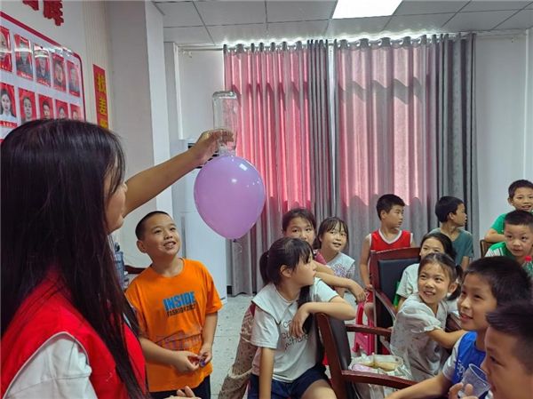 紧接着,志愿者又拿出一个装满热水的玻璃杯,把水倒掉后吸附在吹起的气球上,大约30秒之后,气球就牢牢的粘在玻璃杯上,这可激起了孩子们热烈的讨论。孩子们被有趣的科学实验深深吸引,体会到了科学的神奇,感受到了科学的魅力。