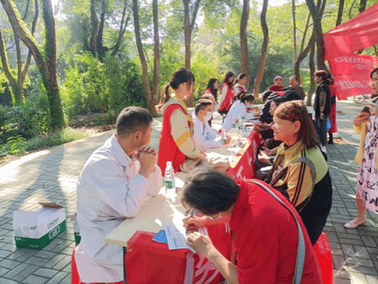 活动伊始,志愿者们协助湖北肿瘤医院开展测血压、量血糖等健康义诊活动,他们搀扶行动不便的老人、引导老人有序排队签到,并为老人们送上精心准备的小礼品。