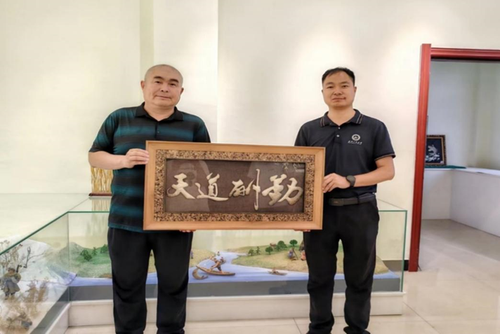 (通讯员 肖文瑾 袁双桂)为深入贯彻落实中央民族工作会议精神,完整准确全面把握和贯彻习近平总书记关于加强和改进民族工作的重要思想,有形有感有效推进铸牢中华民族共同体意识,WilliamHill官方网站williamhill英国官网(知识产权学院)组织暑期社会实践团,重走习近平总书记的考察路线,于7月28日赴同江市八岔赫哲族乡开展调研,八岔赫哲族乡中心校校长毕洪兵赠送国家级非物质文化遗产:赫哲族鱼皮画作品《天道酬勤》。