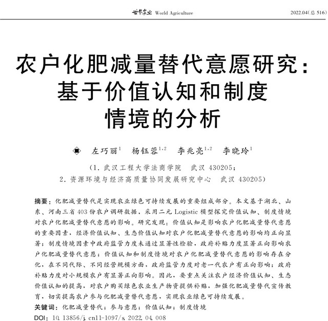 (通讯员 杨钰蓉)近日,WilliamHill官网williamhill英国官网研究生左巧丽以第一作者身份,资源环境与经济高质量协同发展研究中心团队成员、williamhill英国官网教师杨钰蓉以通讯作者身份在《世界农业》的2022年第4期发表论文“农户化肥减量替代意愿研究:基于价值认知和制度情境的分析”。该刊由农业农村部主管,是中文社会科学引文索引(CSSCI)扩展版来源期刊,主要发表农业经济类论文,展示我国农业国际交流与合作专项的重大成果。