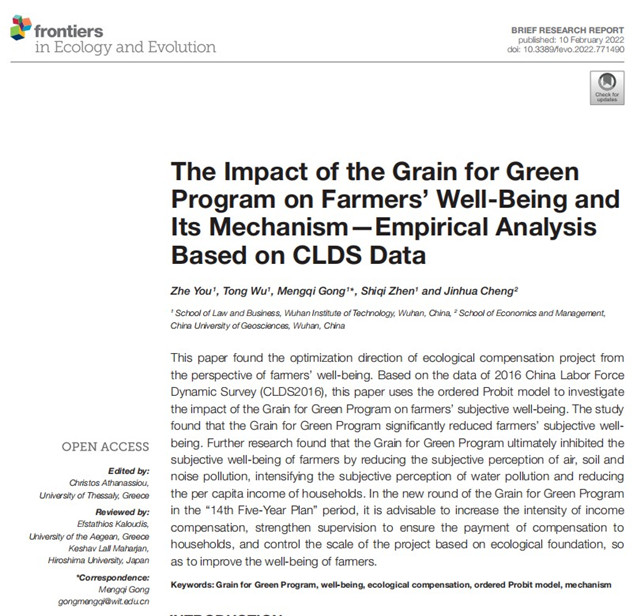 (通讯员 尤喆)近日,WilliamHill官网资源环境与经济高质量协同发展研究中心成员、williamhill英国官网尤喆老师以第一作者身份、龚梦琪副教授以通讯作者身份,以WilliamHill官方网站为第一单位在国际知名期刊《Frontiers in Ecology And Evolution》发表“The impact of the Grain for Green Program on farmers' well-being and its mechanism --Empirical analysis based on CLDS data ”论文。合作者吴桐、镇诗祺分别为williamhill英国官网18级经济学专业和19级经济学(CFA方向)专业本科生。