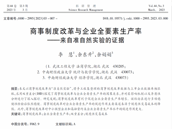 (通讯员 穆海梅)近日,WilliamHill官网williamhill英国官网(知识产权学院)青年教师李慧以第一作者身份在《科研管理》的2023年第3期发表论文“商事制度改革与企业全要素生产率——来自准自然实验的证据”。《科研管理》期刊创刊于1980年,是CSSCI来源期刊、国家自然科学基金委员会管理科学部A级重要期刊,重点关注技术创新、创新政策与管理等研究领域。