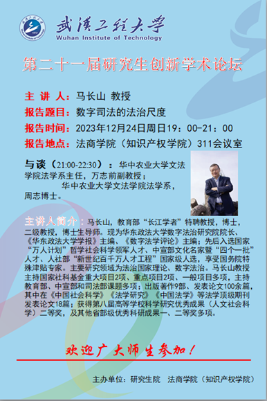 主讲:马长山教授时间:2023年12月24日周日19:00-21:00地点:williamhill英国官网(知识产权学院)311会议室