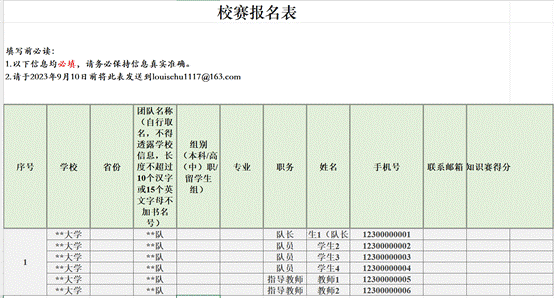 5、《校赛报名表》《知识赛考生信息汇总表》请于2023年9月10日15:00以前发送至邮箱louisehu1117@163.com,过时不候。