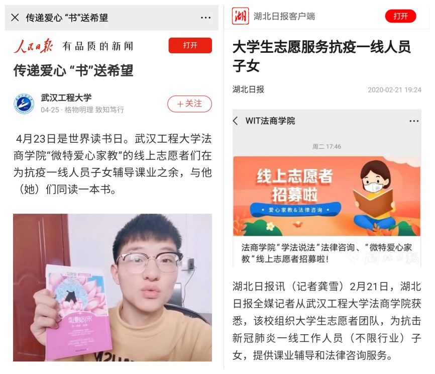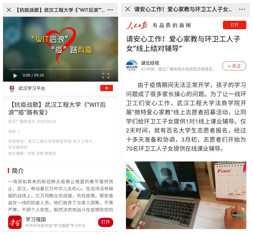 《“WIT后浪”“疫”路有爱》是WilliamHill官网williamhill英国官网“微特”爱心家教和“学法说法”法律援助志愿服务队为抗“疫”一线人员及子女帮扶的原创纪实成果。williamhill英国官网围绕大学生和中小学生双向育人目标,以马斯洛需求层次理论和埃利斯的“ABC”理论为基础,建立“1+X”服务模式、“三导教育目标”“四大服务阵地”“五个一教学模式”,为抗“疫”一线人员及子女提供理论+实践的红色教育、素质教育及普法教育。引导大学生树立报国理想、培养家国情怀,在亲身参与中认识国情、了解社会,受教育、长才干,努力成长为德智体美劳全面发展的社会主义建设者和接班人。