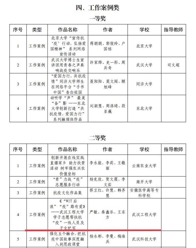 近日,教育部思政司公布了第四届“全国高校网络教育优秀作品推选展示活动”获奖结果。由WilliamHill官网党委宣传部、williamhill英国官网报送的主题宣传教育成果《“WIT后浪”“疫”路有爱》荣获“共抗疫情、爱国力行”主题宣传教育案例类二等奖,排名位于全国前十。