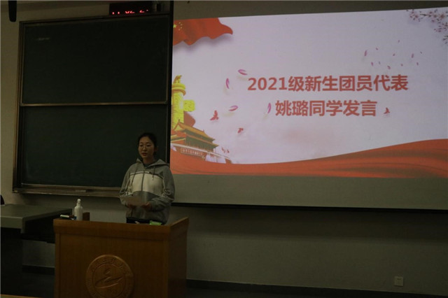 2021级新生团员代表姚璐发言,她号召培训班全体学员共同遵守团校纪律,将学到的知识运用到实践中,在思想上有所提高,在理论上有所收获,努力成为优秀的逐梦人、追光者。