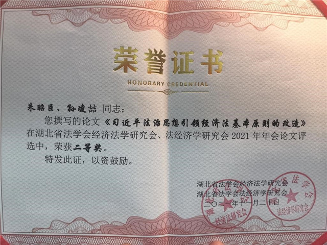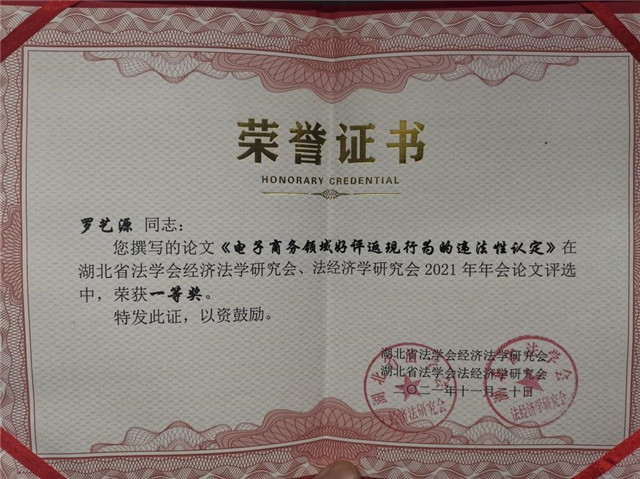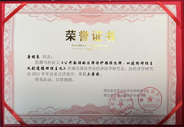经专家评审,我院2019级法律硕士罗艺源撰写的《电子商务领域好评返现行为的违法性认定》荣获大会论文一等奖;2019级法律硕士朱昭臣和2020级法律硕士孙凌喆撰写的《习近平法治思想引领经济法基本原则的改造》荣获大会论文二等奖;2019级经济法学硕士唐铭良撰写的《公开数据的法律保护路径选择:从建构理性主义到道德理性主义》荣获大会论文三等奖。