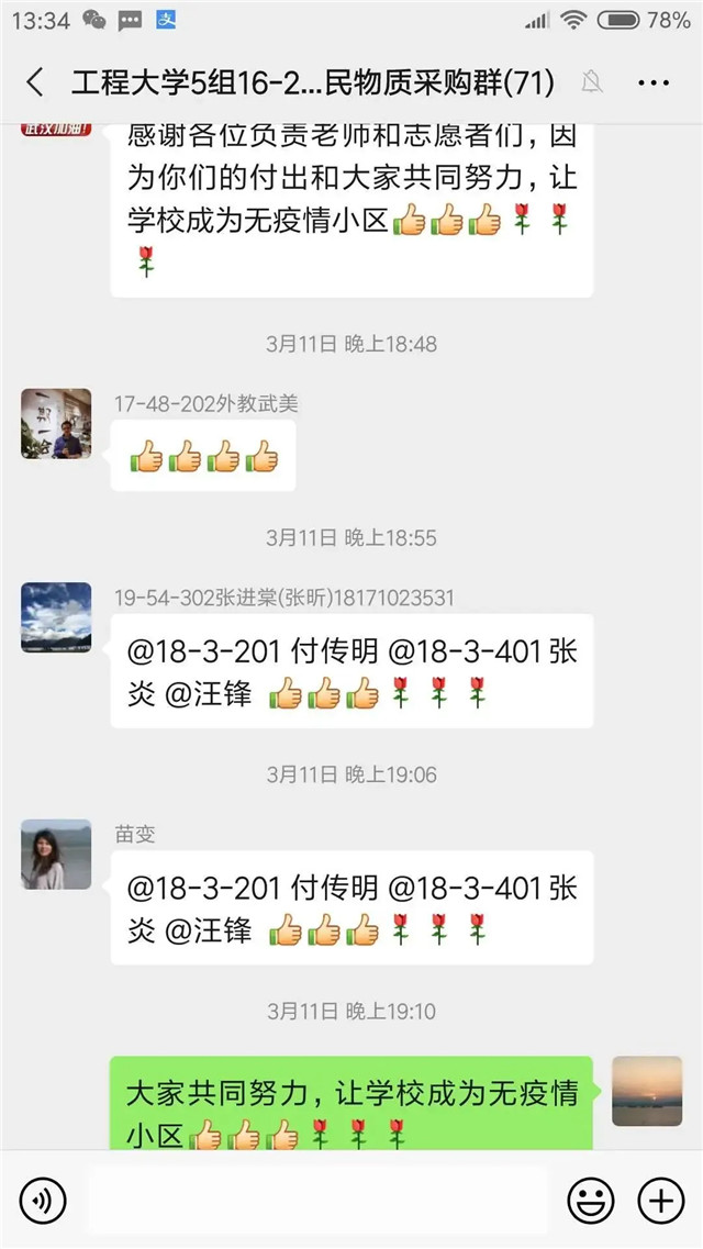 今天,工程大社区志愿者微信群建立起来了,志愿者们陆续加入了群,有些老师们相互熟识,也有不认识的,大家相互热情打着招呼,相互鼓励,共同的志向和使命使大家聚在了一起。