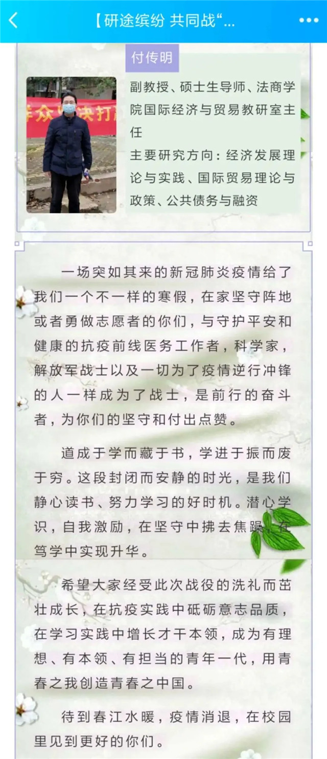 春风化雨、润物无声。在疫情防控的非常时期,他注重化“疫”为机,主动给予学生关怀和温暖,激荡他们不畏艰险、积极向前的青春报国情怀。他在给研究生的导师寄语中写道“要在抗疫实践中砥砺意志品质,在学习实践中增长才干本领,成为有理想、有本领、有担当的青年一代,用青春之我创造青春之中国。”在疫情防控最吃紧的时刻,他以志愿者教师身份录制视频,以国旗下的发言形式宣讲抗疫形势和学校志愿服务情况,勉励同学们树立道路自信、理论自信、制度自信、文化自信,以实际行动展现当代大学生的青春风采。